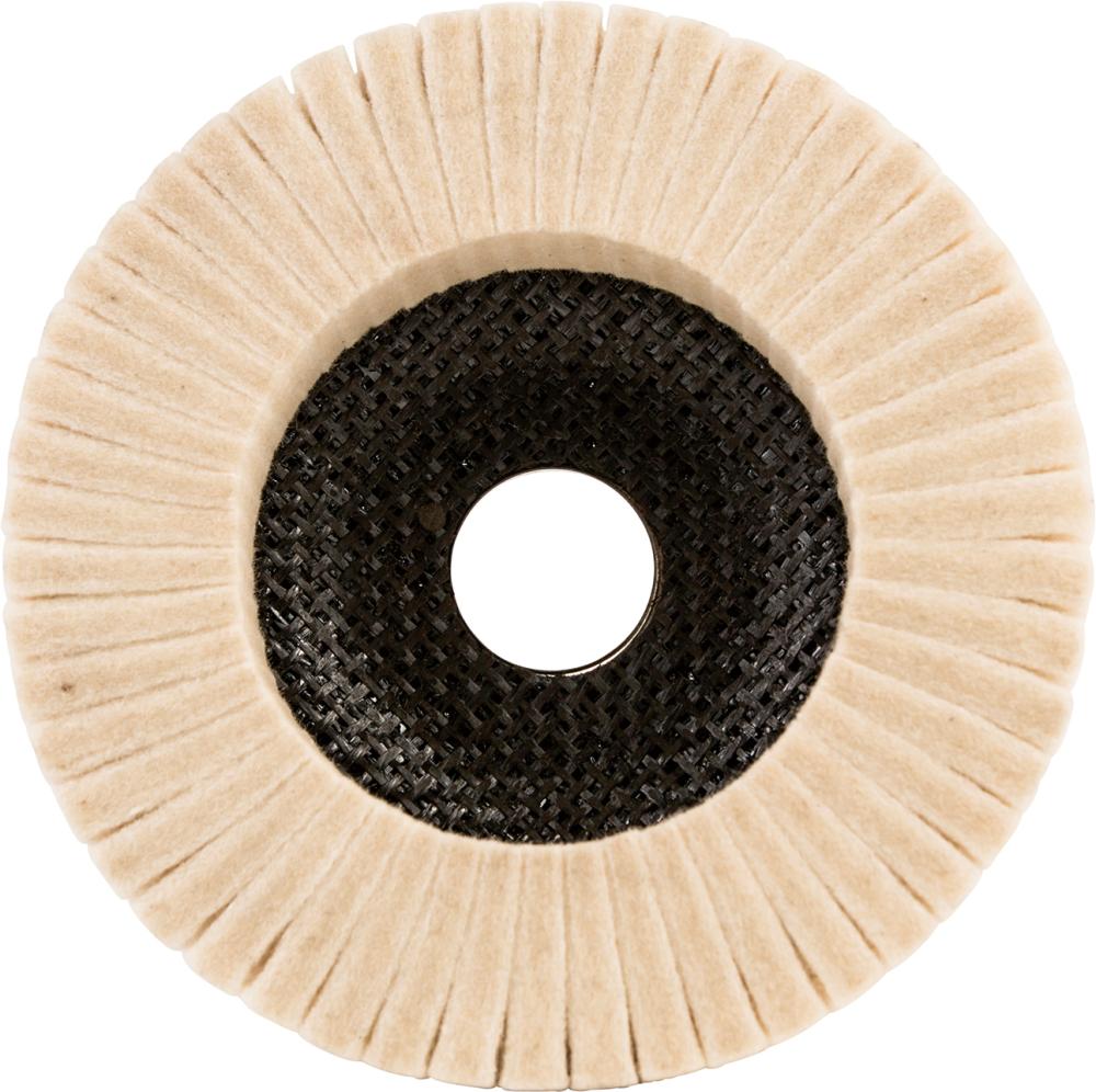 Wykonanie: ze 100 % naturalnego filcu i z talerzem podporowym z włókna szklanego. Listki umożliwiają idealne dopasowanie tarczy do obrabianego konturu przedmiotu oraz redukują obciążenie termiczne.