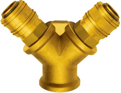 Wykonanie: Z mosiądzu, z gwintem wewnętrznym (GW), z dwoma rozgałęzieniami z szybkozłączkami NW 7,2.