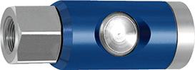 Wykonanie: Wersja z przyciskiem zwalniającym. Obudowę wykonano z aluminium z uszczelkami z NBR, odpornymi na działanie olejów i wysokiej temperatury. Przycisk i wentyl z hartowanej stali cynkowej. Części wewnętrzne ze stali szlachetnej, gwint z niklowanego mosiądzu. Przepływ przy ciśnieniu 6 bar wynosi 1600 l/min (dla powietrza) (deltap = 1 bar). Te szybkozłącza są zgodne z ISO Standard 4414.
