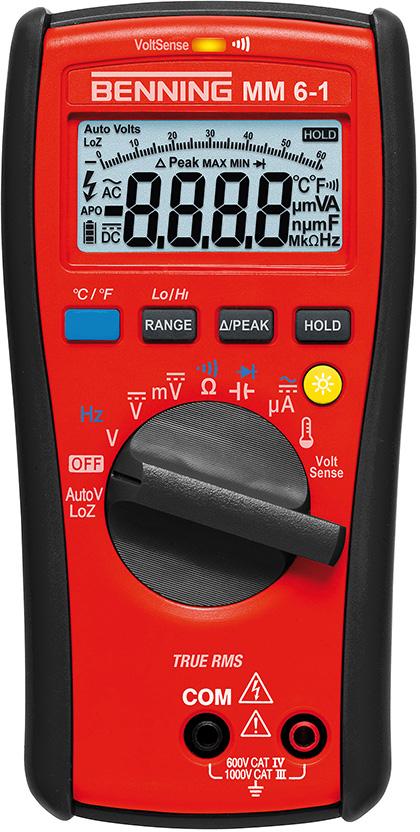 MM 6-1. Mikroamperowe zakresy pomiarowe (600,0 µA) do pomiarów jonizacji w systemach grzewczych. Funkcja Auto V do automatycznego rozpoznawania napięcia stałego i przemiennego, niska impedancja wejściowa (LoZ) do tłumienia napięcia powstałego pojemnościowo i indukcyjnie. HOLD, PEAK, REL. wraz z czujnikiem temperatury drutu.