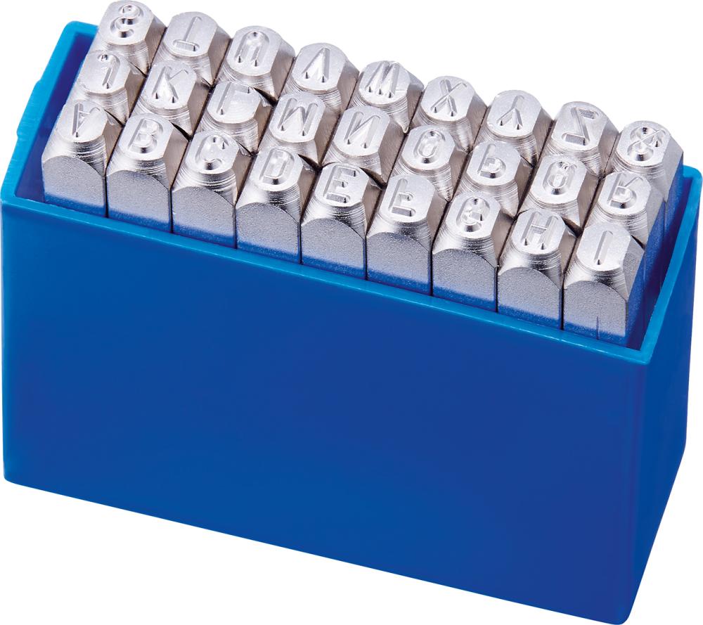 Wykonanie: 27 części (A–Z, duże litery). Ze specjalnej stali narzędziowej wysokiej jakości, czcionka zgodnie z normą DIN 1451. Dostawa zestawu w pudełku z tworzywa sztucznego.